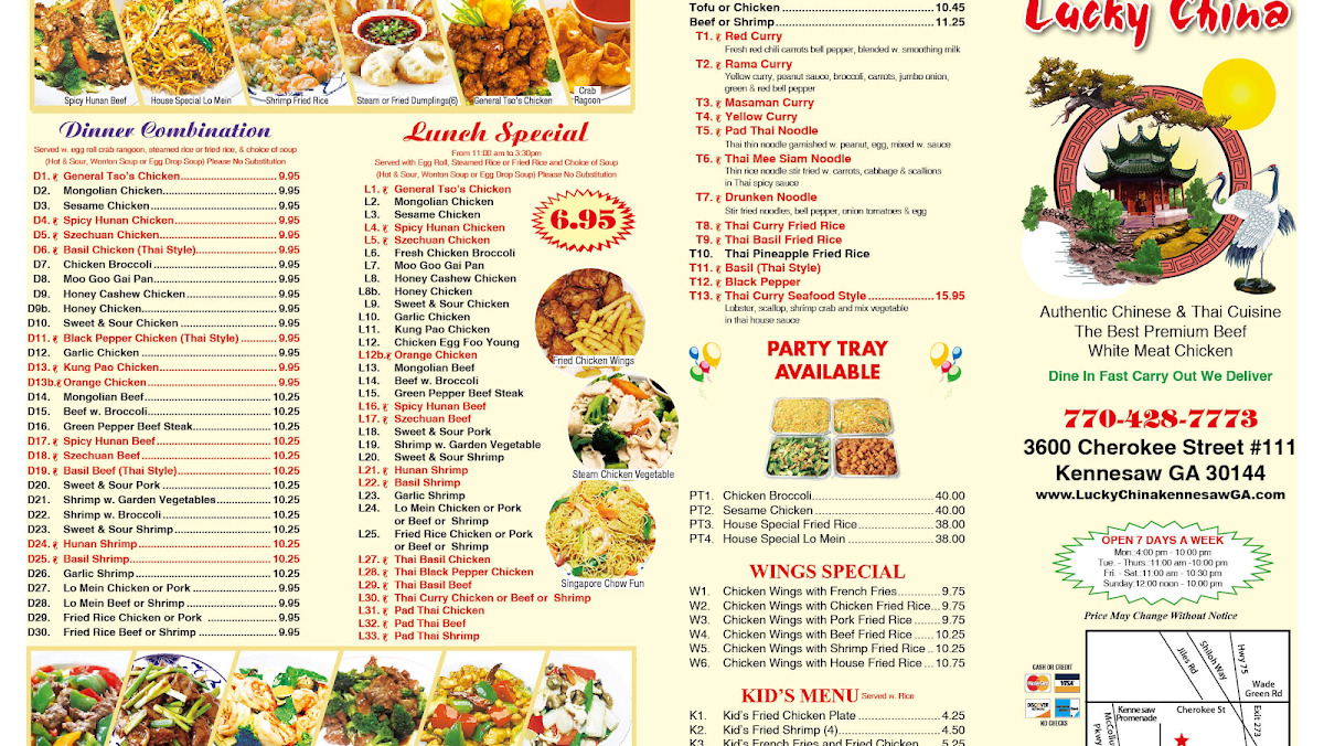 Welcome to Lucky China, a celebrated takeout gem located in Kennesaw, GA, known for its mouthwatering dishes and unbeatable value. The menu boasts a variety of authentic Chinese offerings that consistently impress locals. Highlights include the pad thai and chicken and broccoli, praised for their flavorful balance and freshness. Customers rave about the hot braised wings and house fried rice, making them staple choices for many regulars.